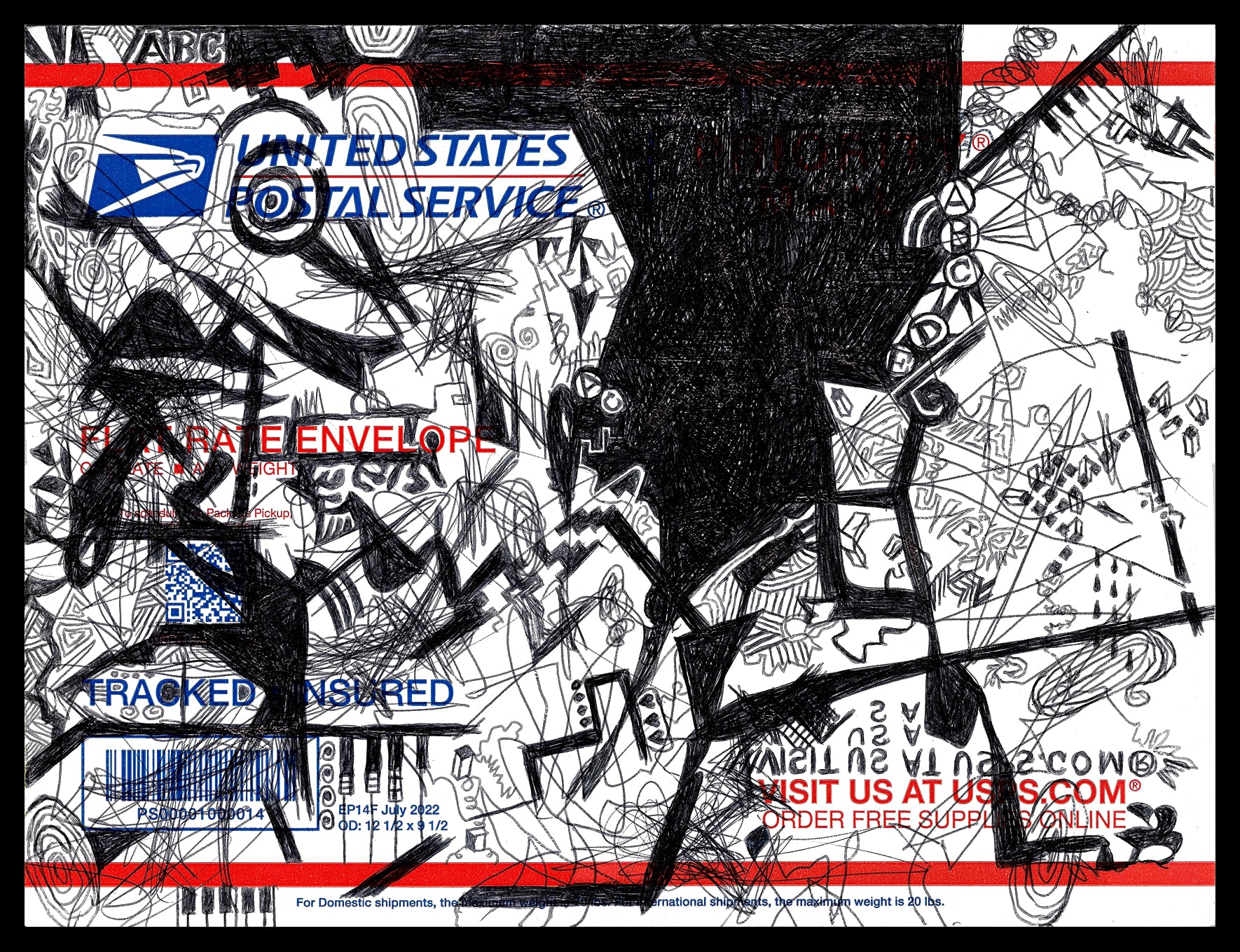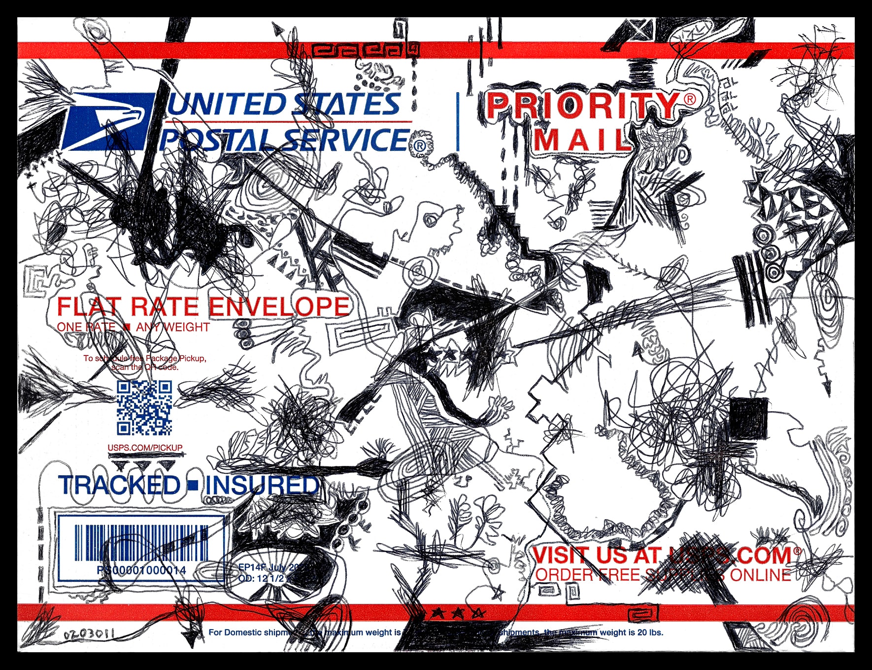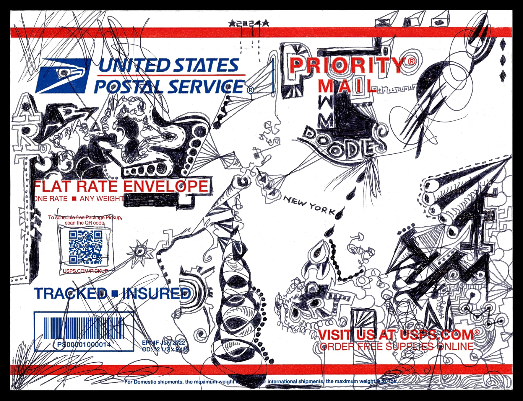 The USPS flat rate mailing envelopes that have some letters on already in my bookshelf, was perfect for doodles. Doodling on a completely blank white paper goes against that spirit.